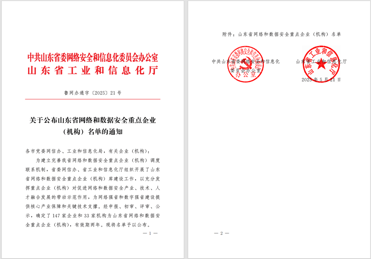 成功入选《山东省网络和数据安全重点企业(机构)名单》,成为33家网络和数据安全重点机构的一员。据悉,此次评选由山东省委网信办和山东省工业和信息化厅组织,旨在遴选一批具备核心竞争力的企业(机构),发挥其对促进网络和数据安全产业、技术、人才融合发展的带动示范作用,为山东省建设“网络强省”“数字强省”提供关键技术支撑和产业保障。
